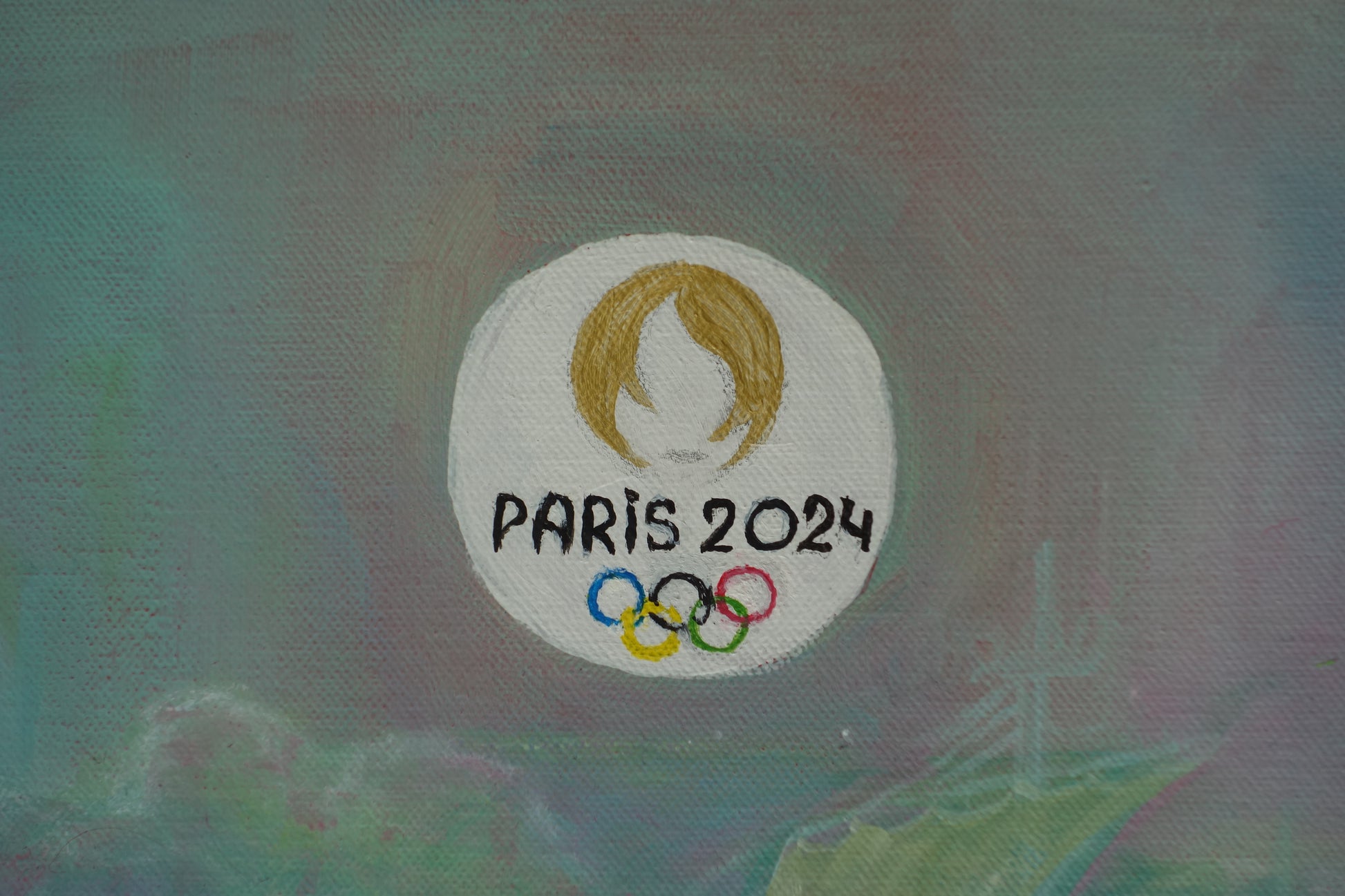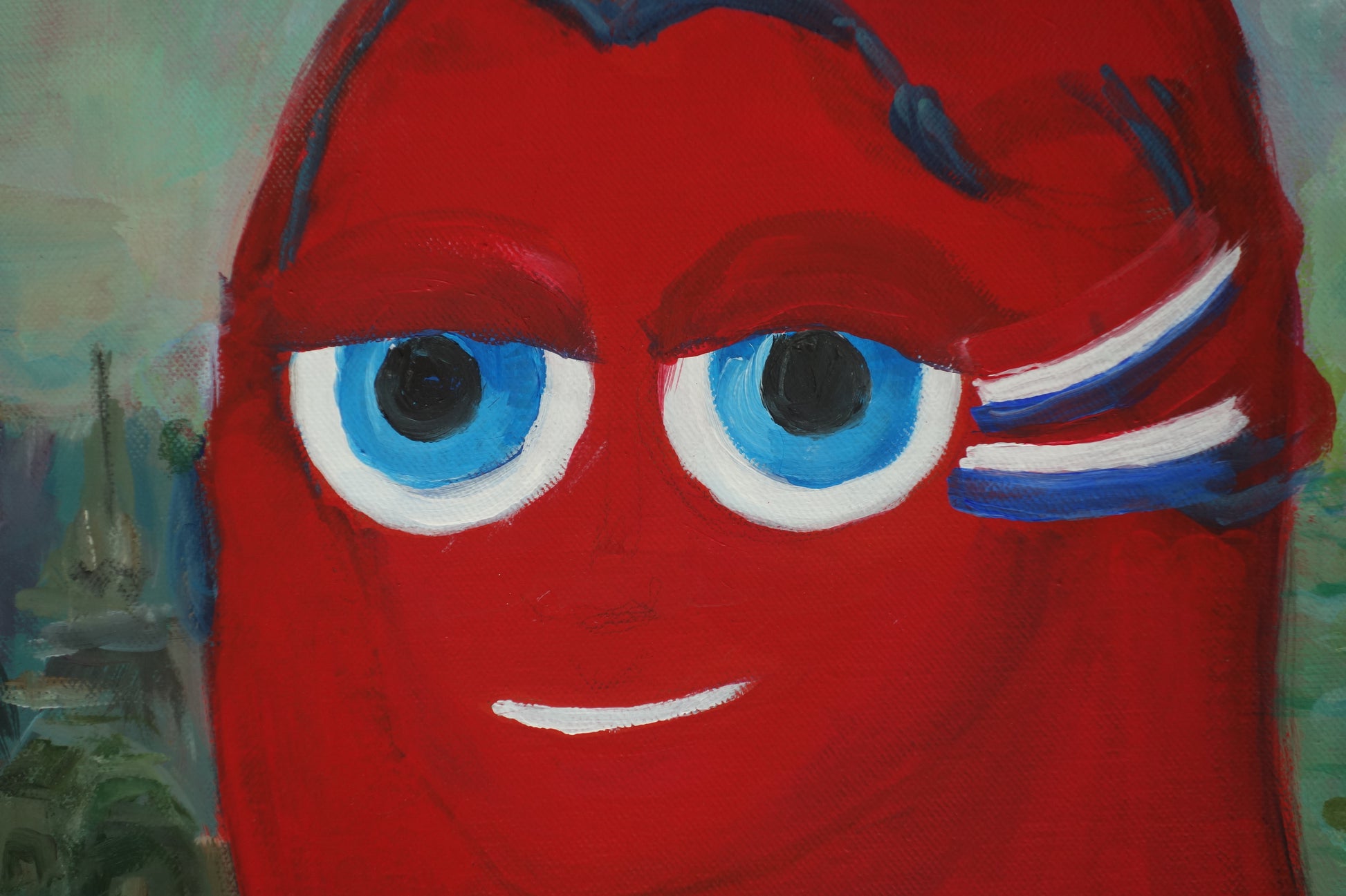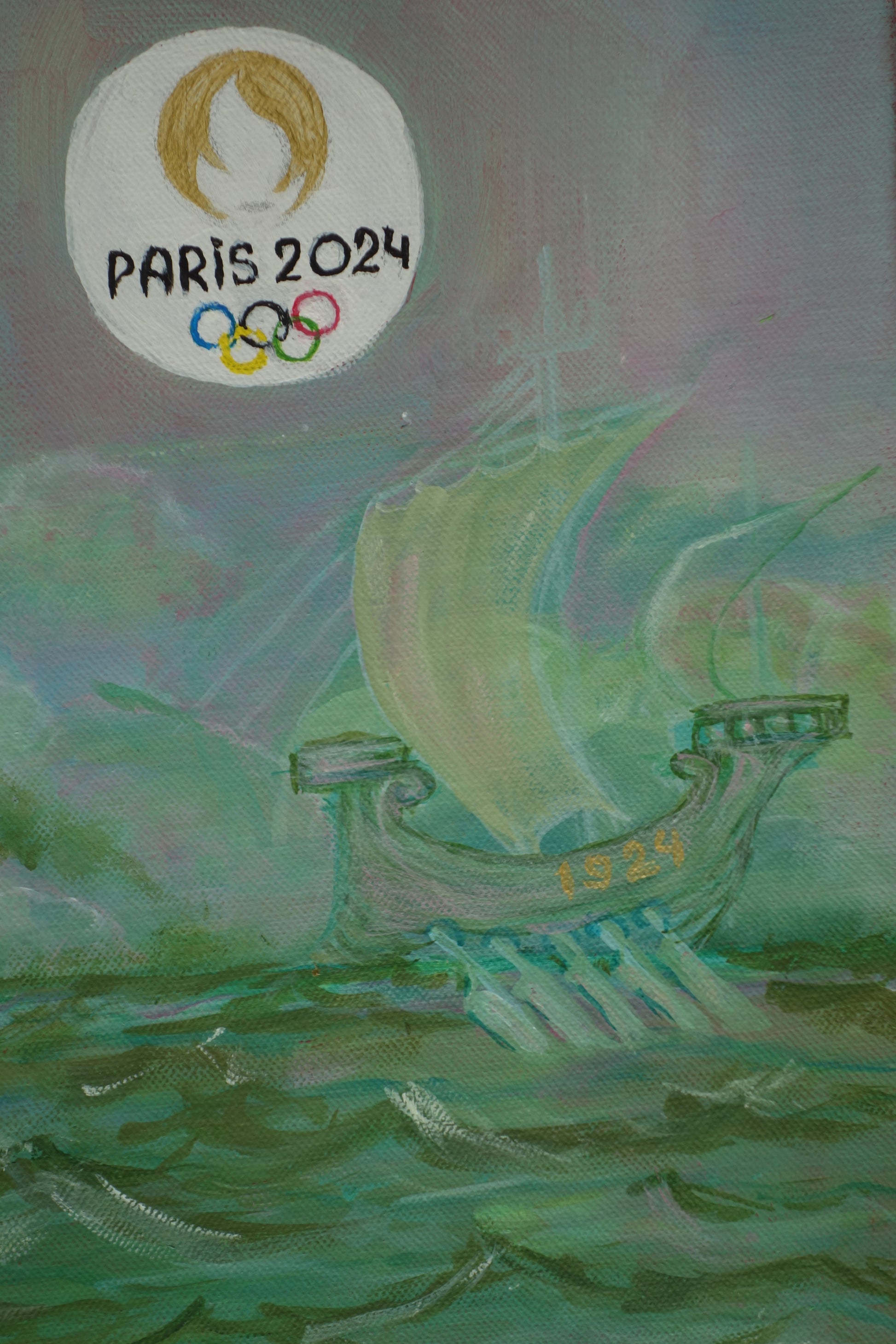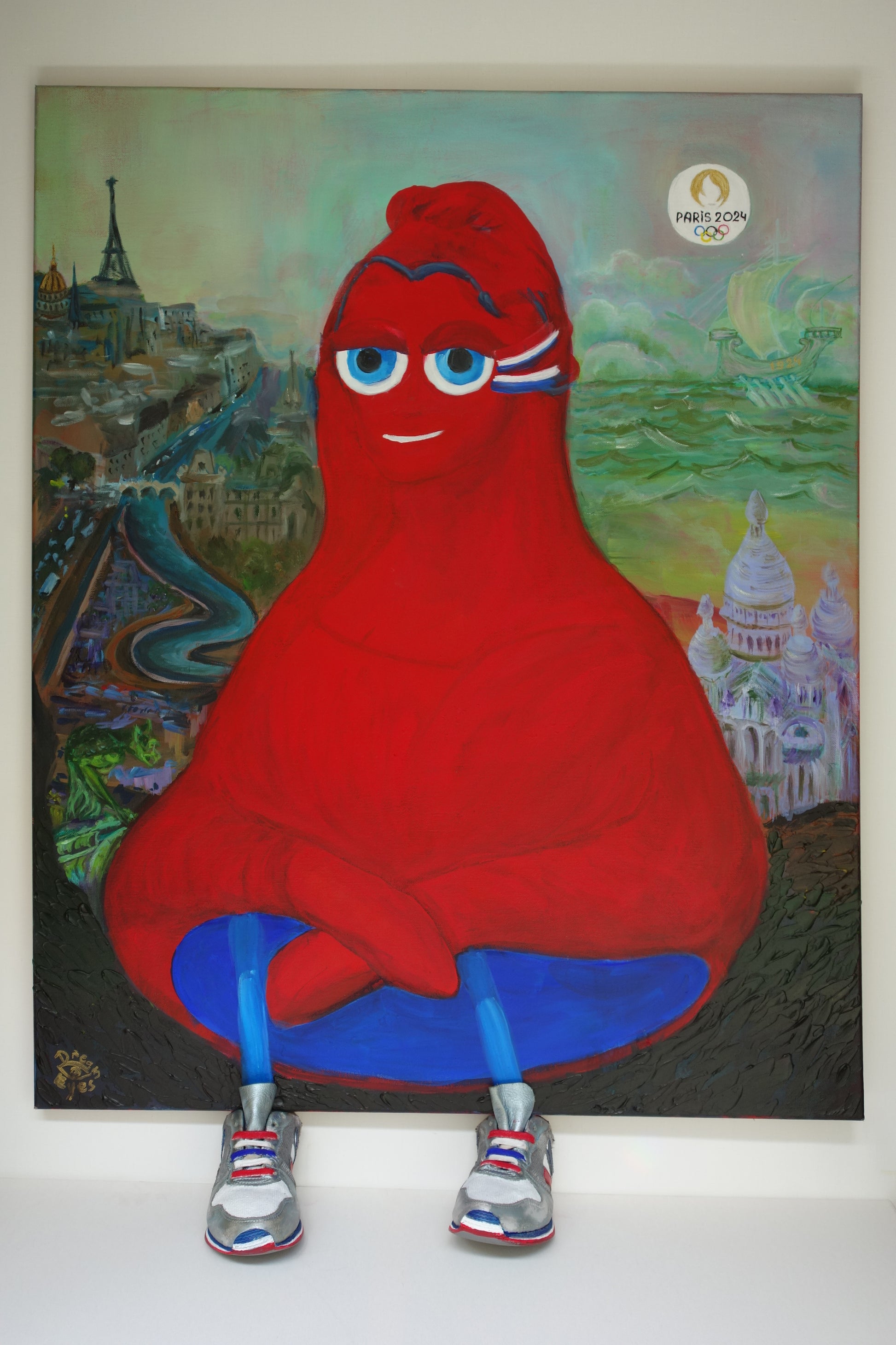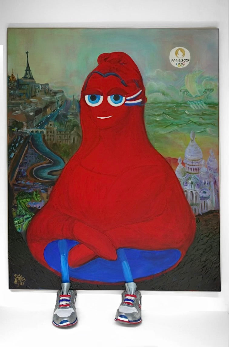 Peinture à l'acrylique à l'effigie du Phrygie, mascotte des Jeux Olympiques 2024 avec hommage au Jeux Olympiques 1924.