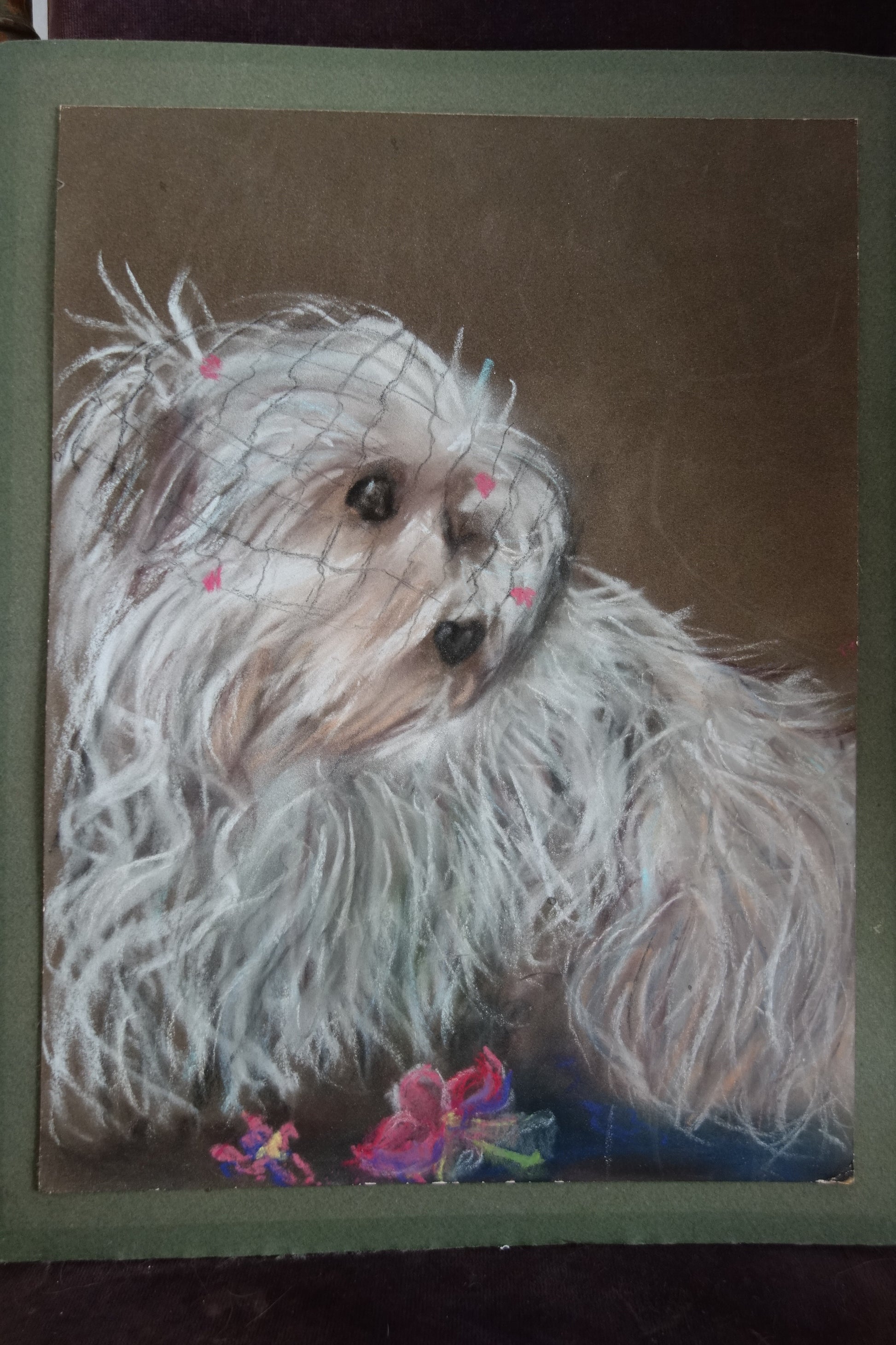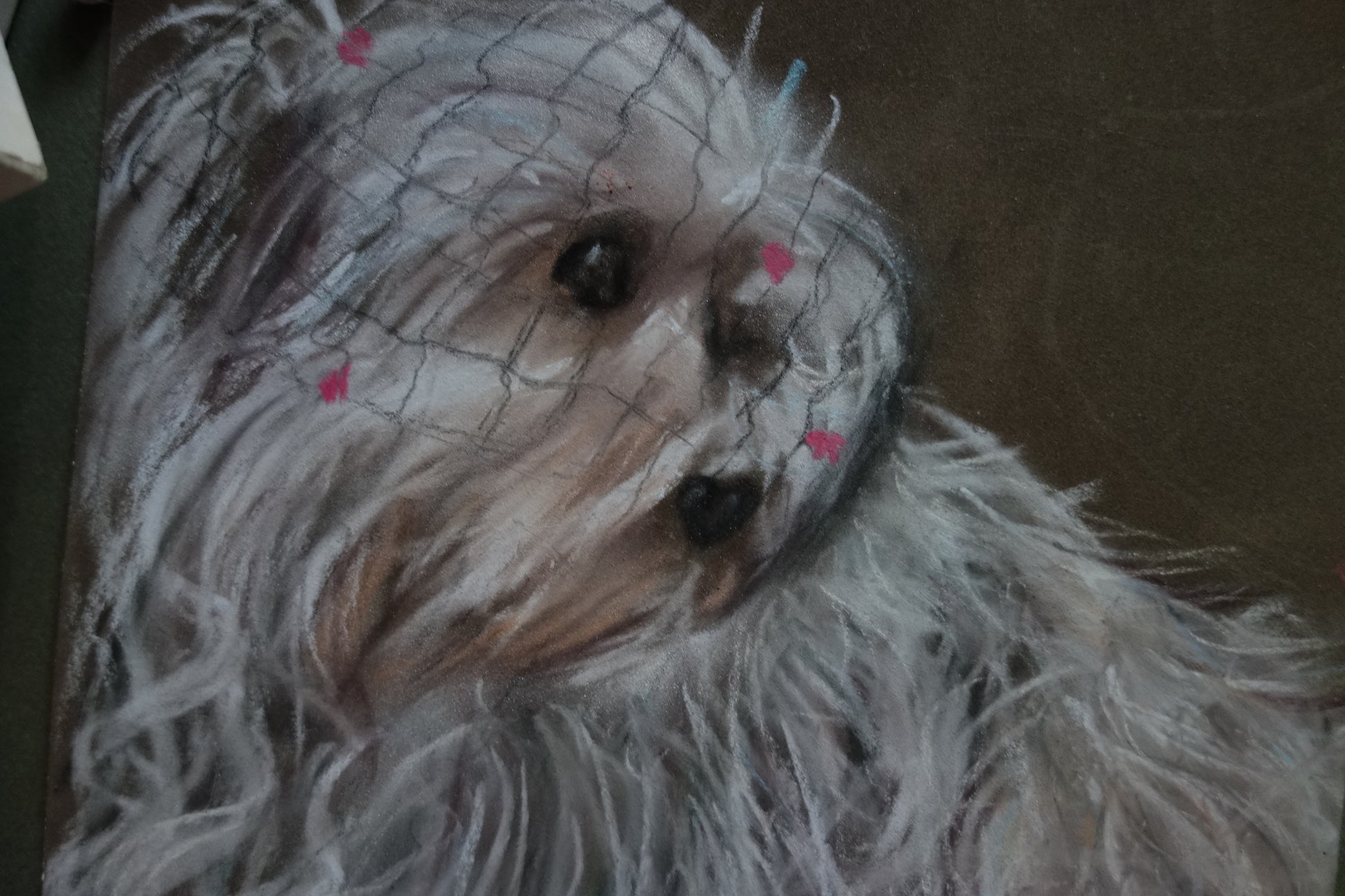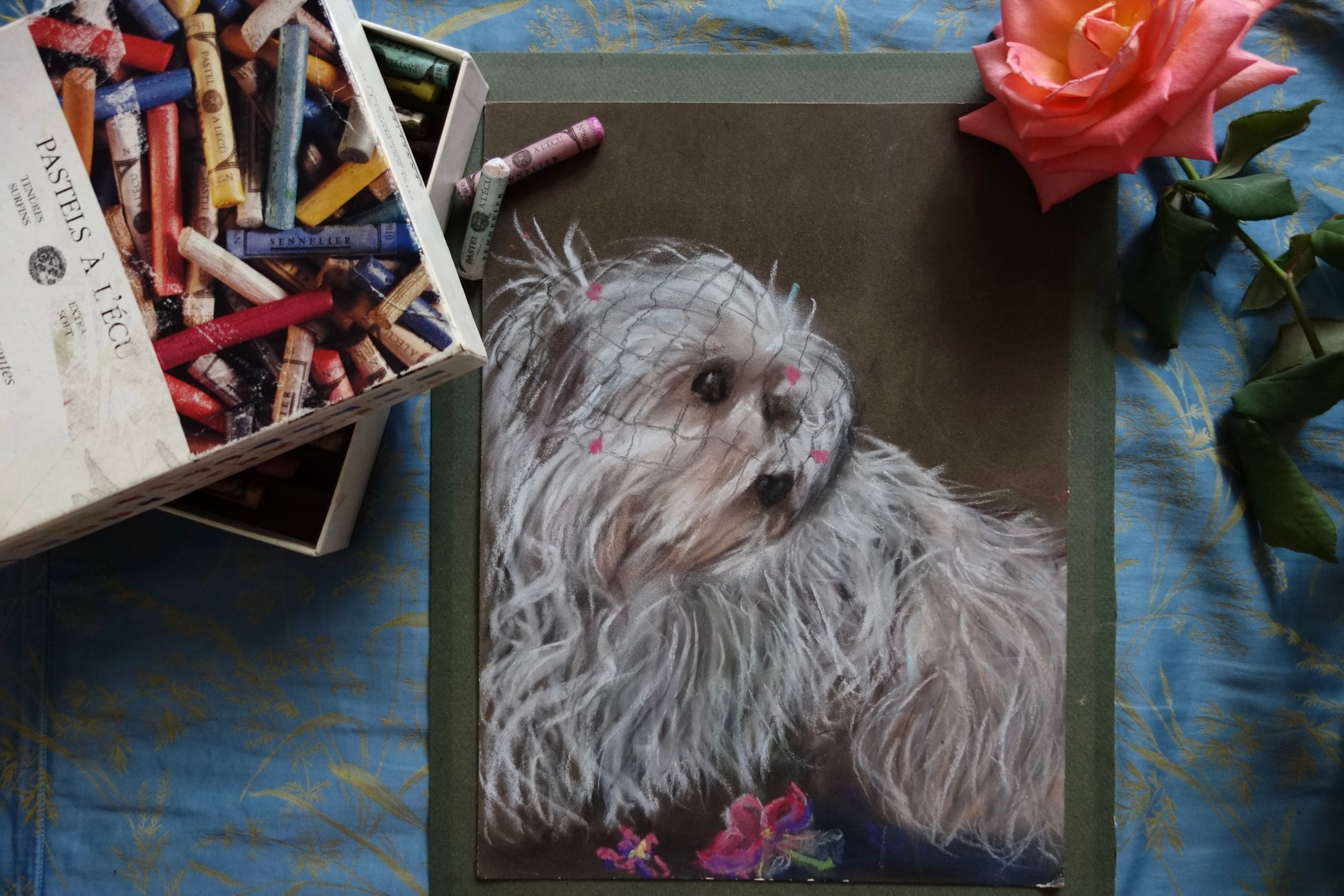 Portrait de bichon maltais réalisé au pastel sur papier canson.