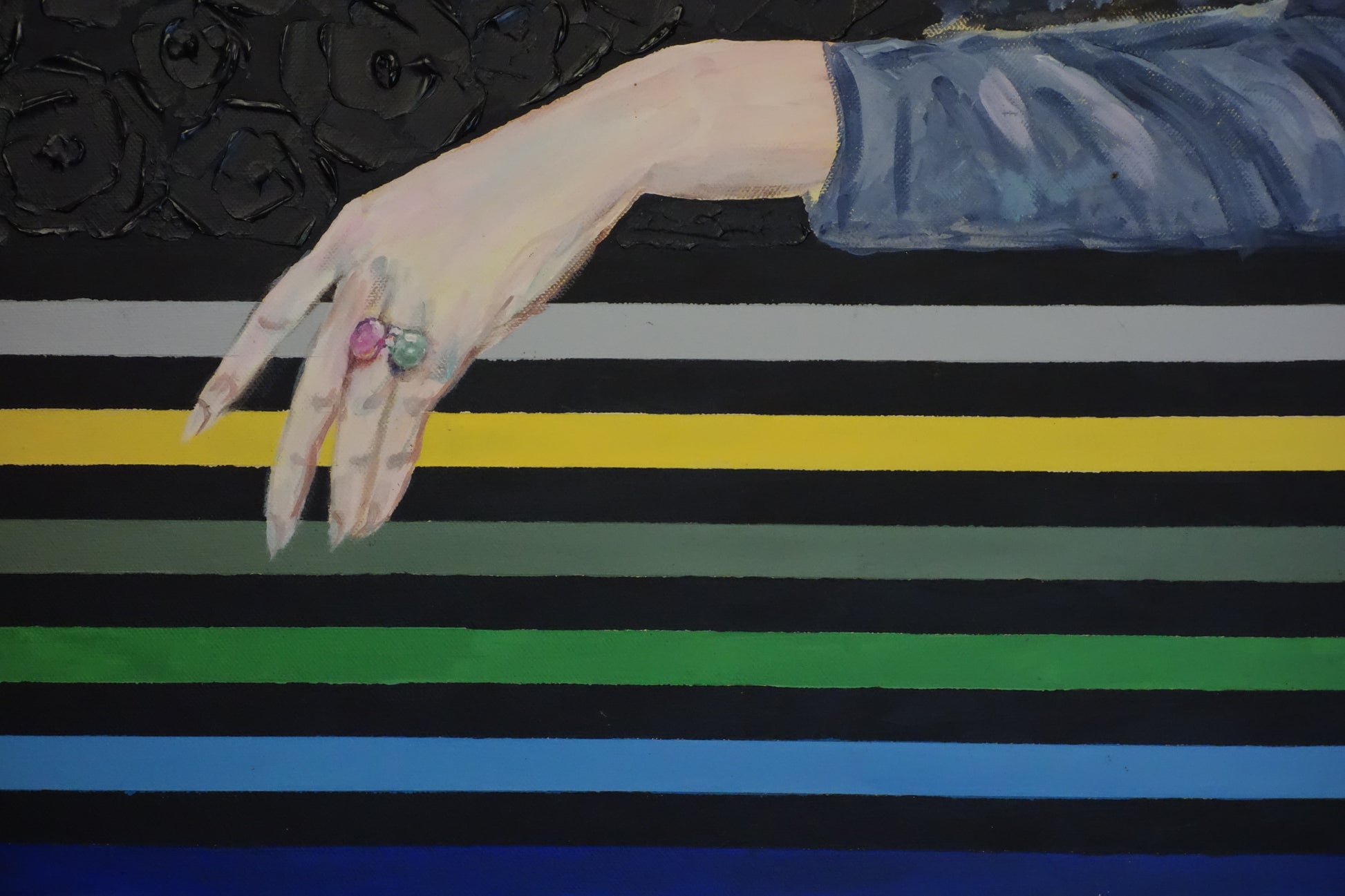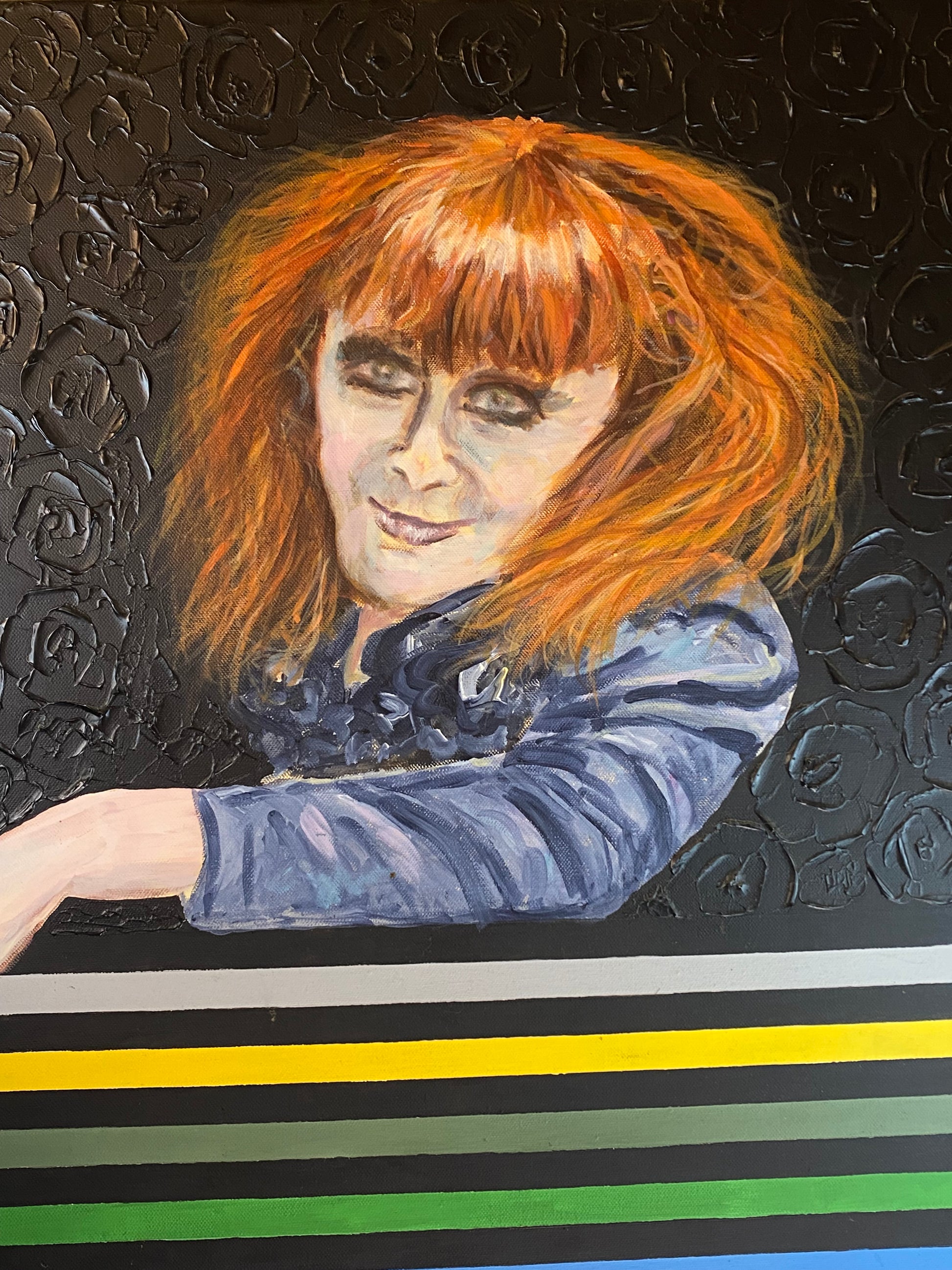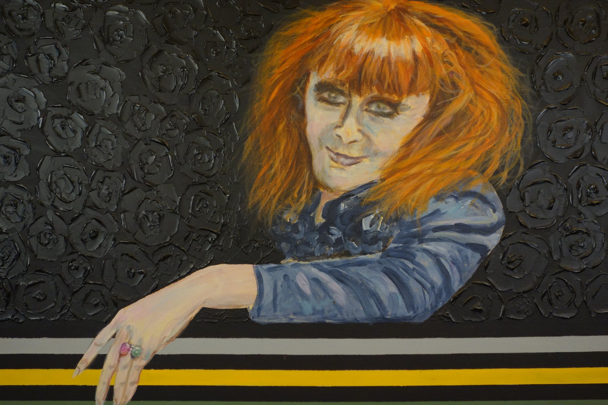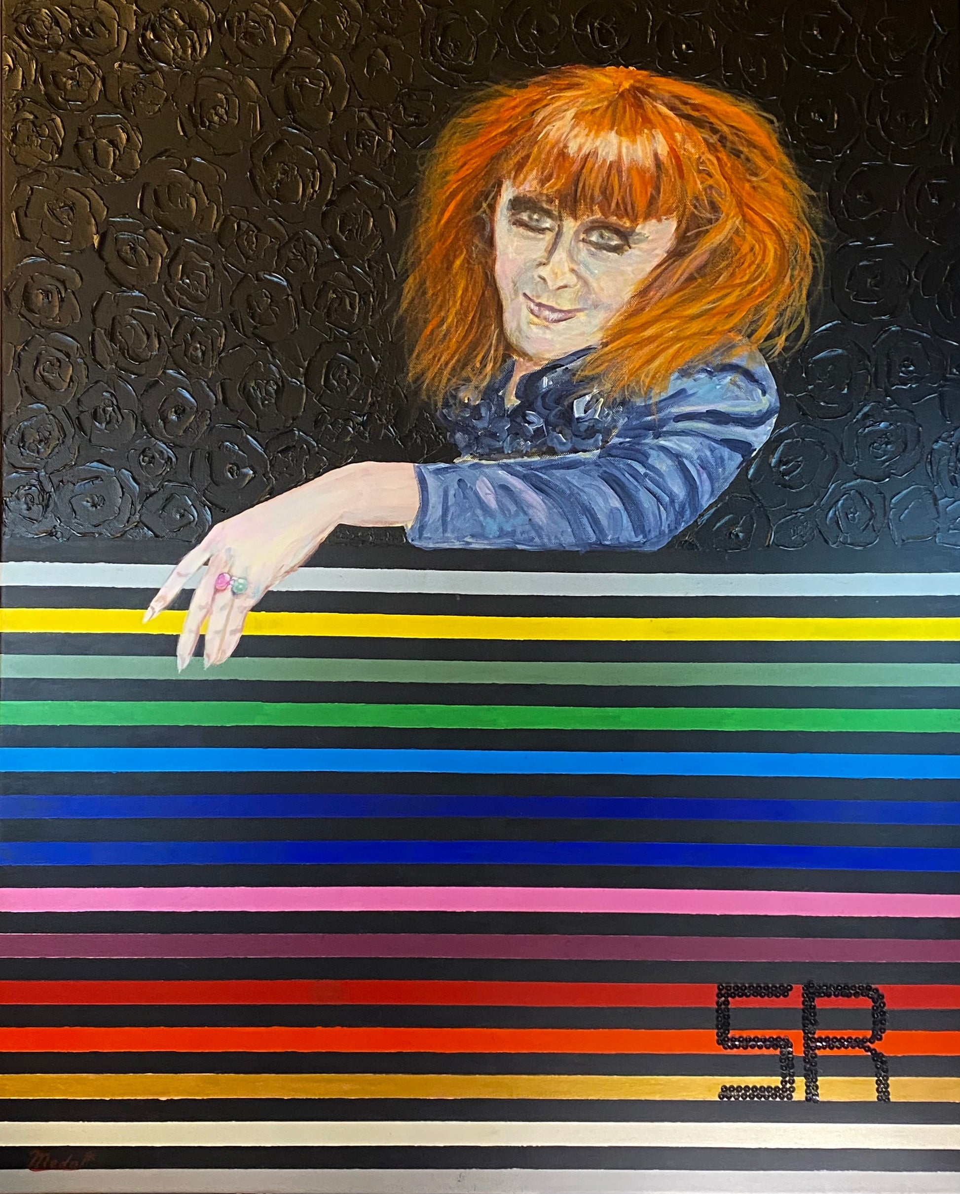 Composition sur toile représentant la créatrice de mode Sonia Rykiel, avec relief de roses.